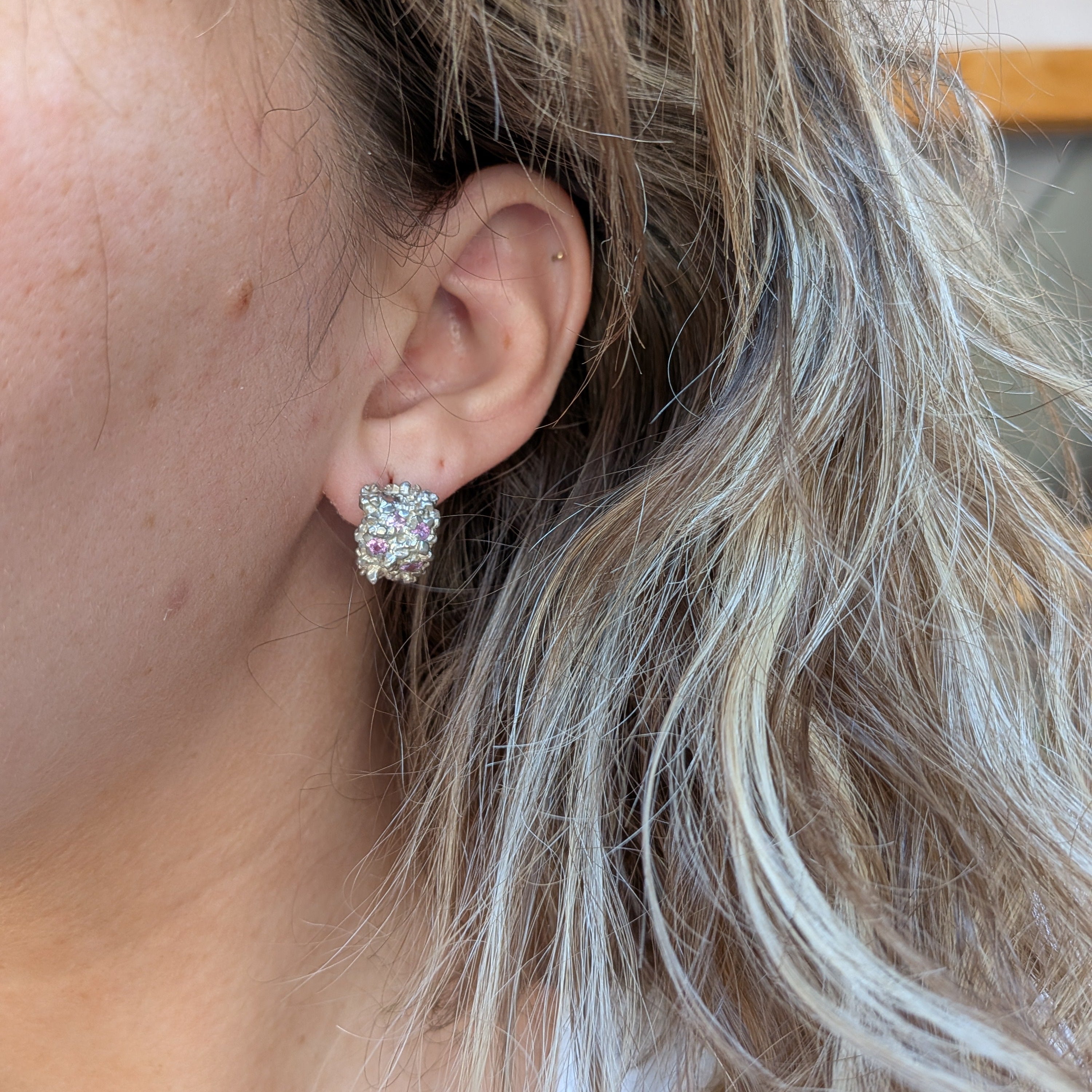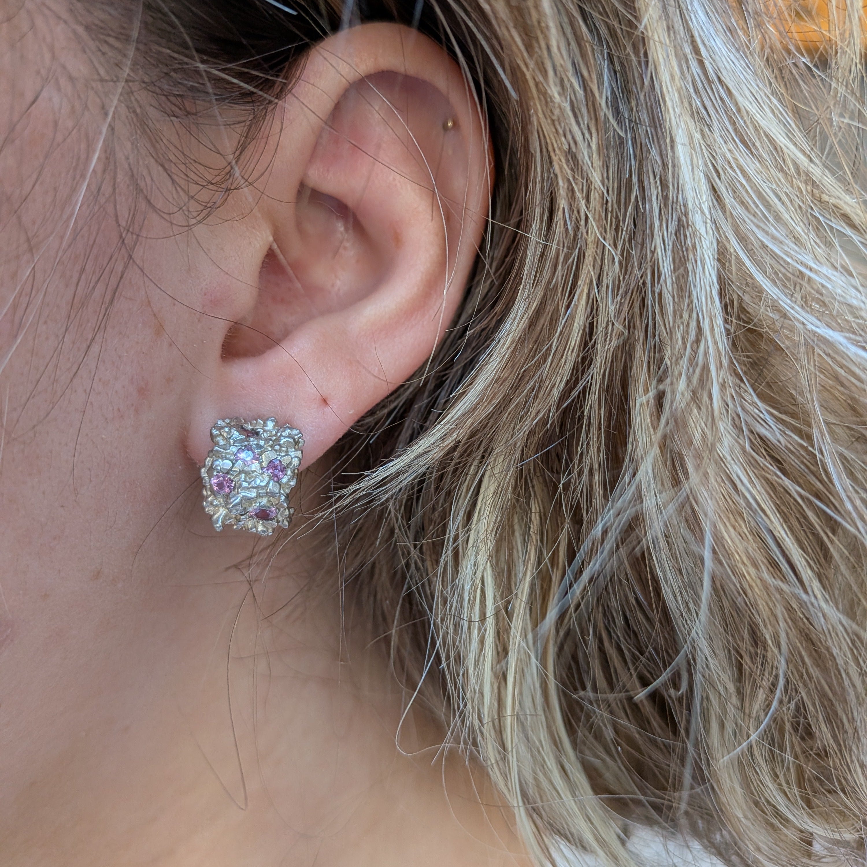 Sterling silver chunky huggie hoop earrings encrusted with pink sapphires.