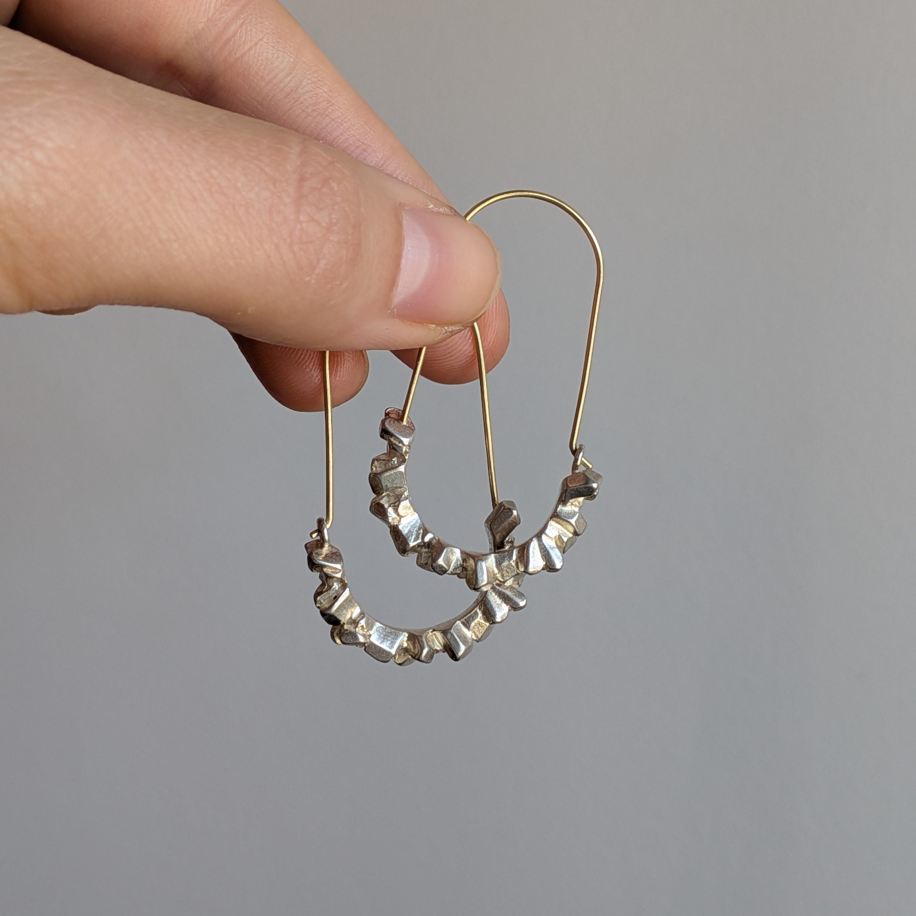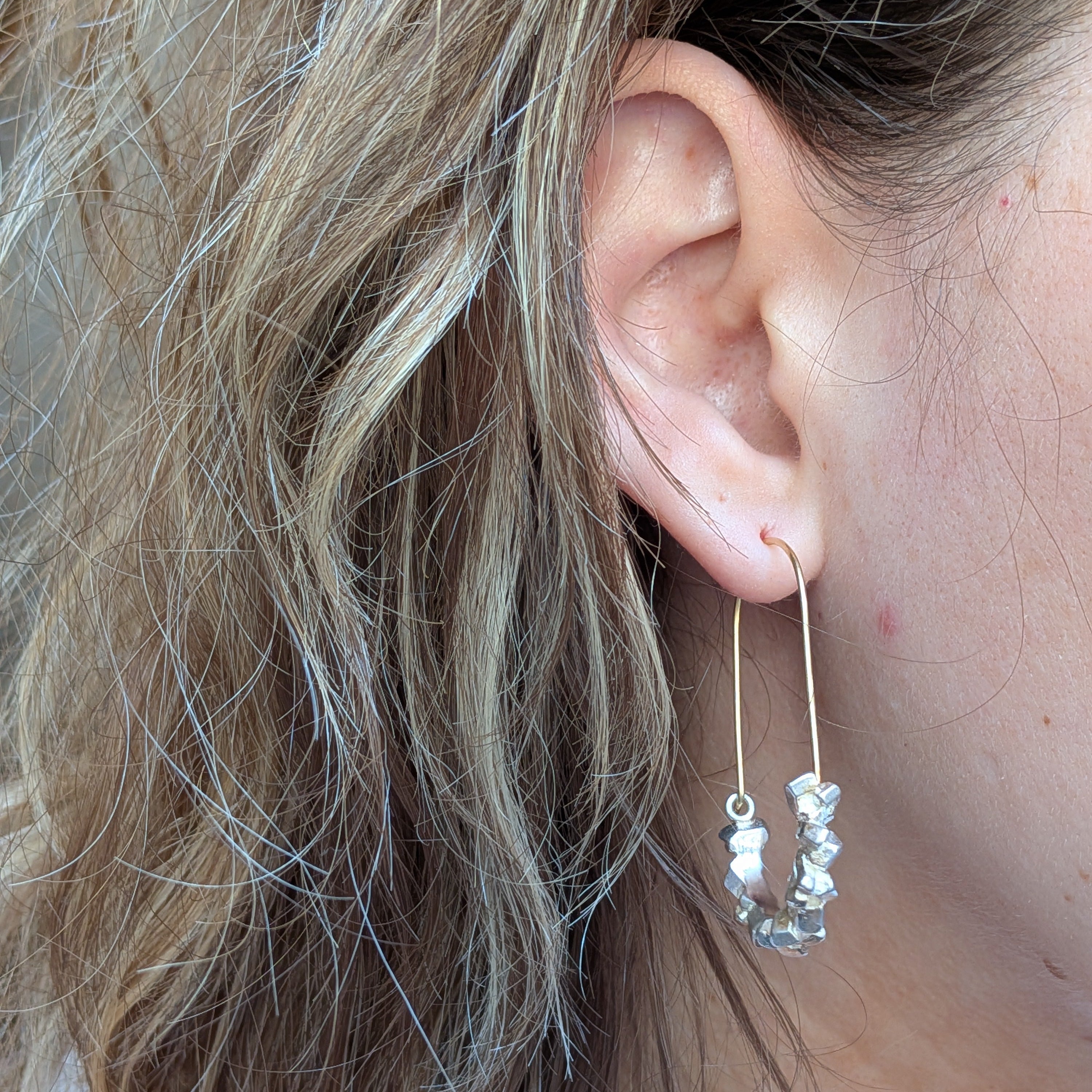 Elongated oval hoop earrings featuring Kelsey's signature sugar crystal texture. Crafted from homegrown sugar and then cast in sterling silver, these earrings hang from 18k yellow gold wires.