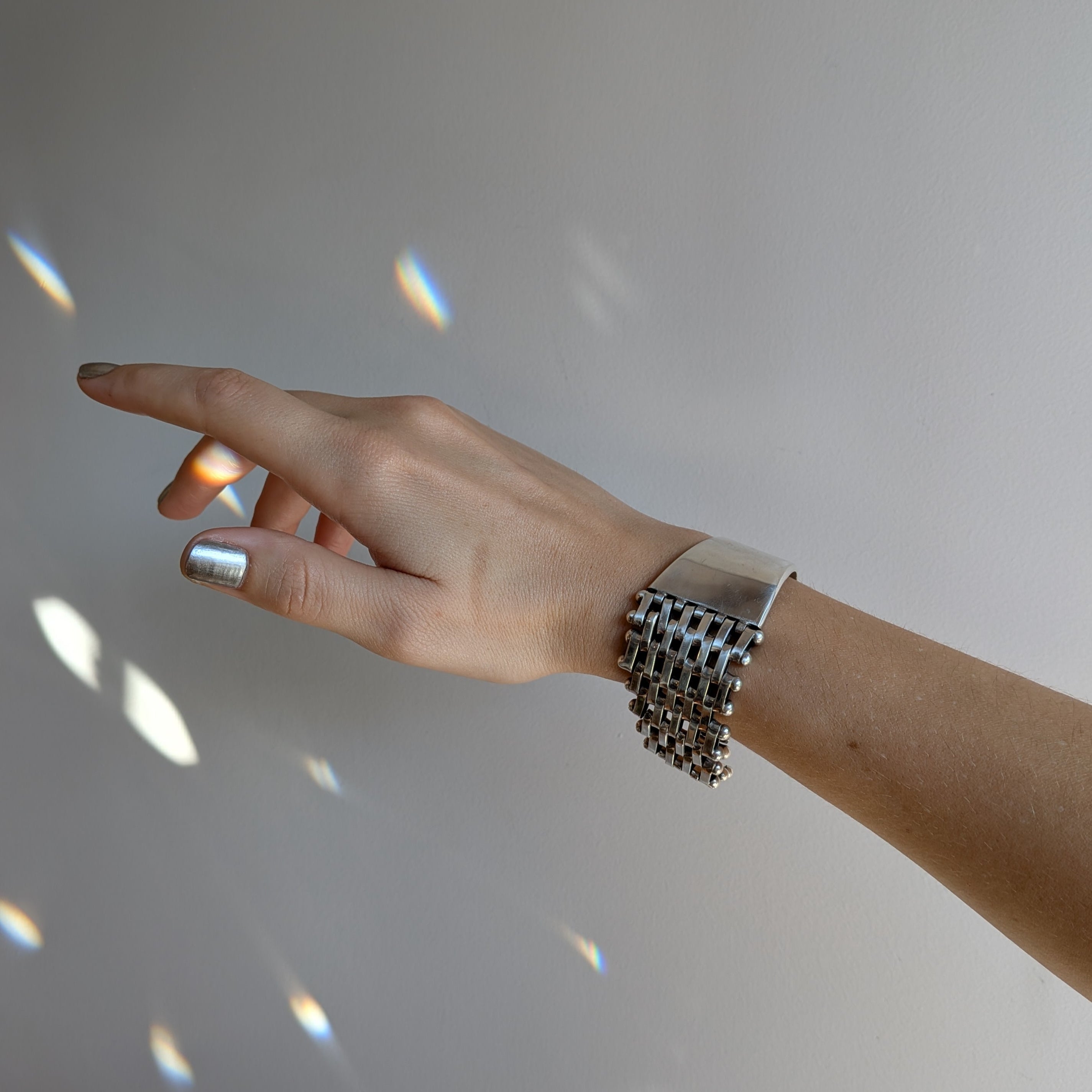 Heavyweight Taxco silver finished with a box clasp.