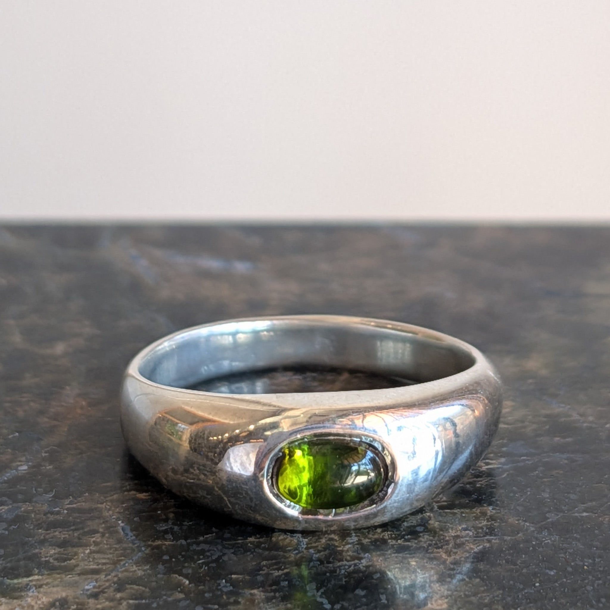 A soft domed signet ring featuring a green tourmaline cabochon set in bright sterling silver. Smooth and comfortable in texture, cool and cheerful in tone.