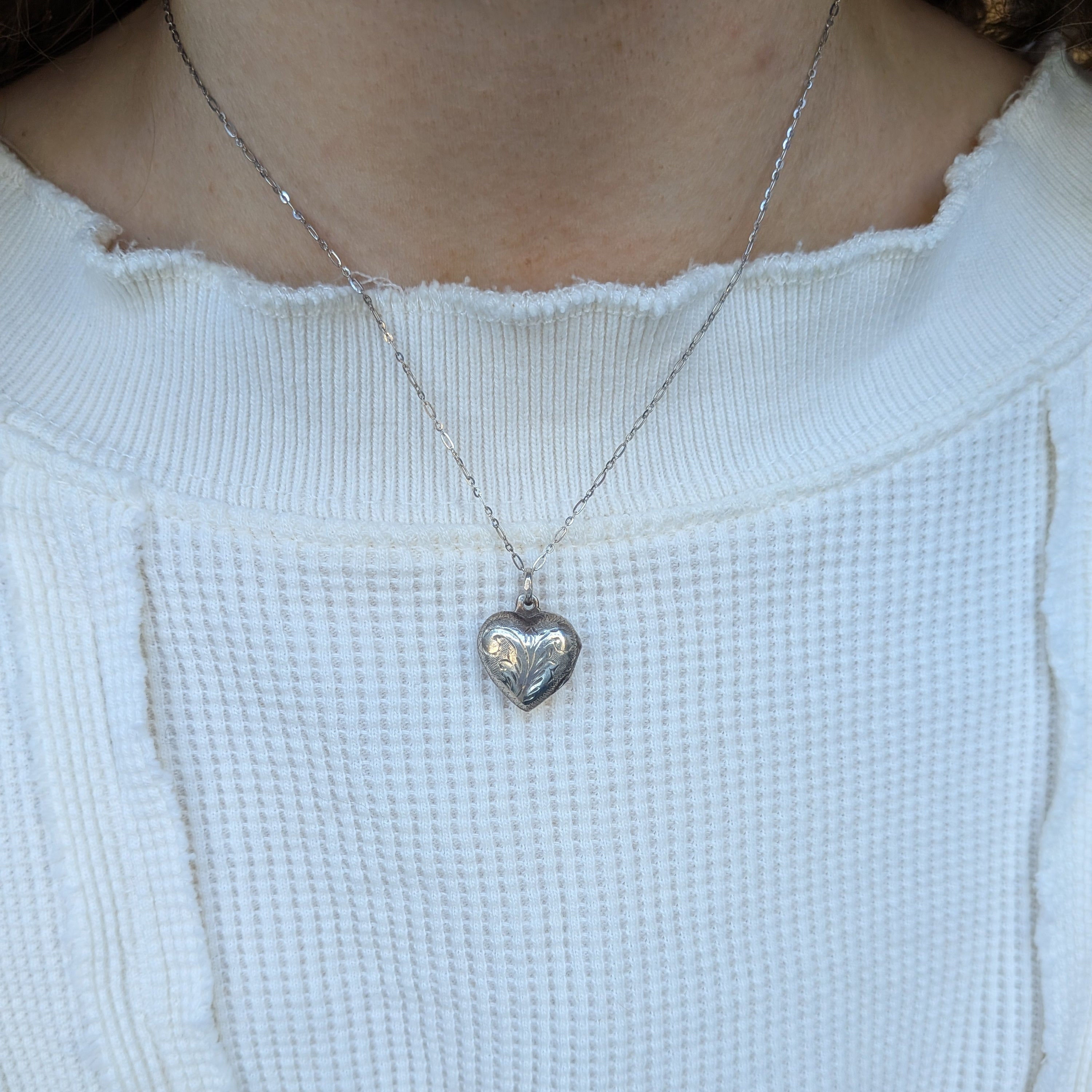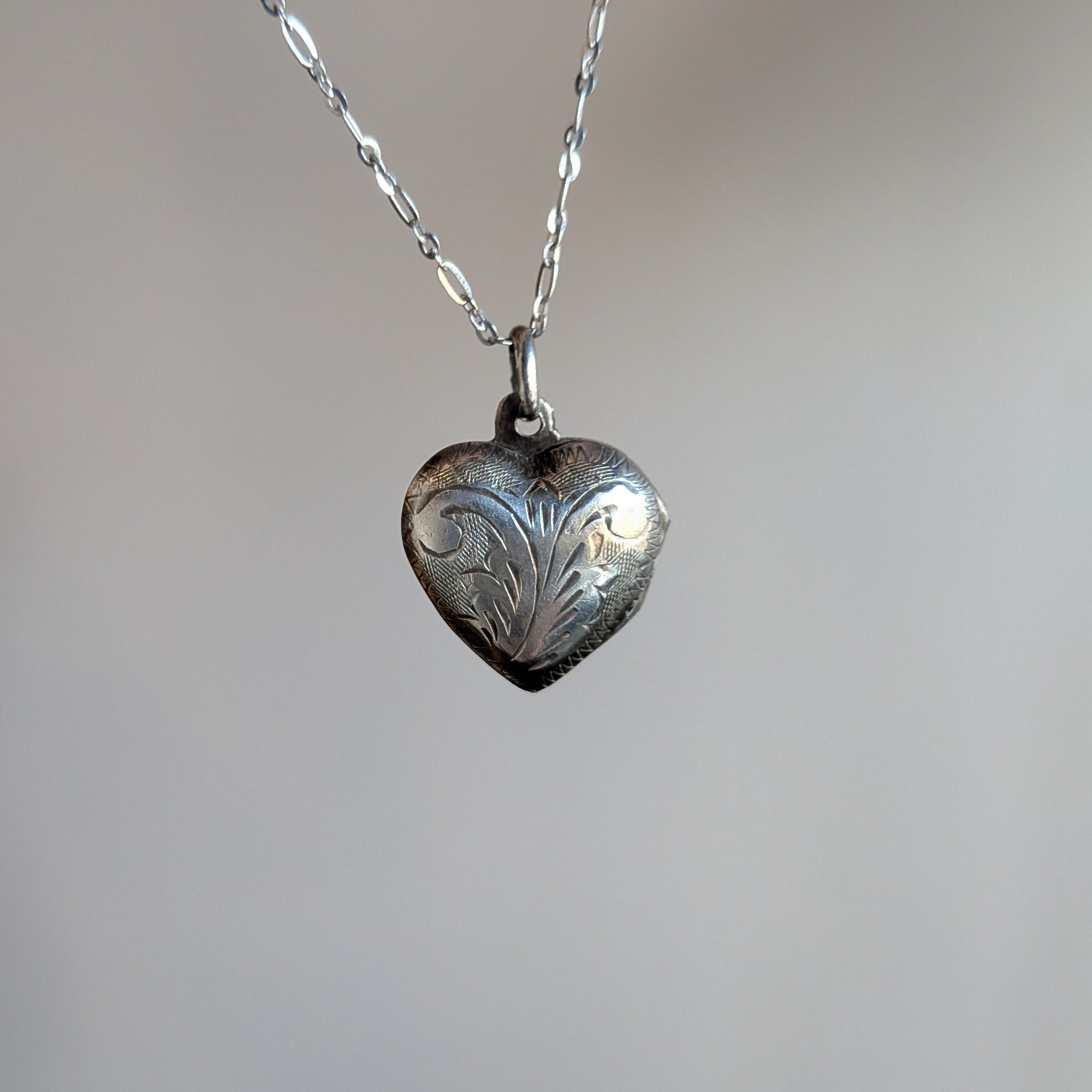 A sweet heart locket etched with floral detailing.