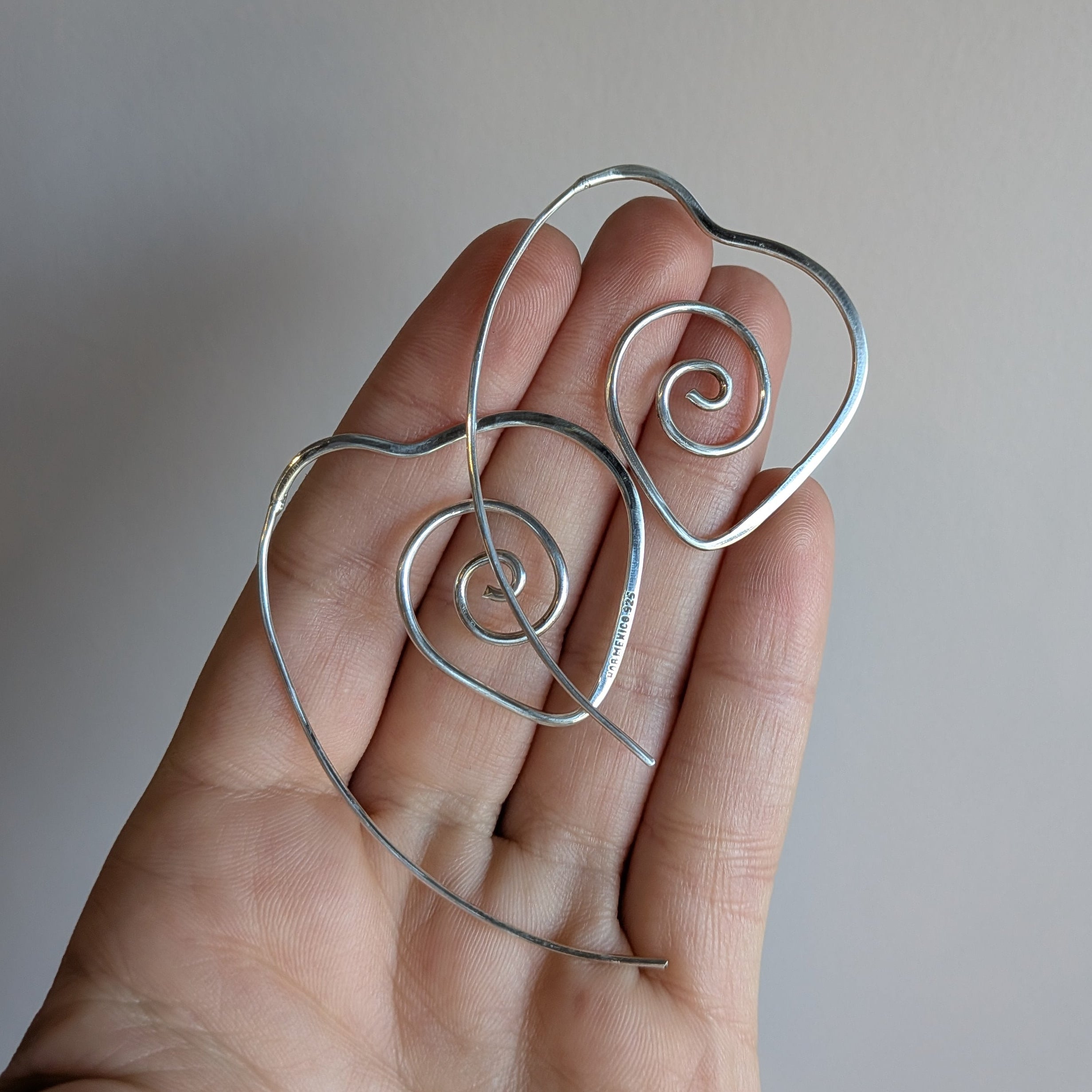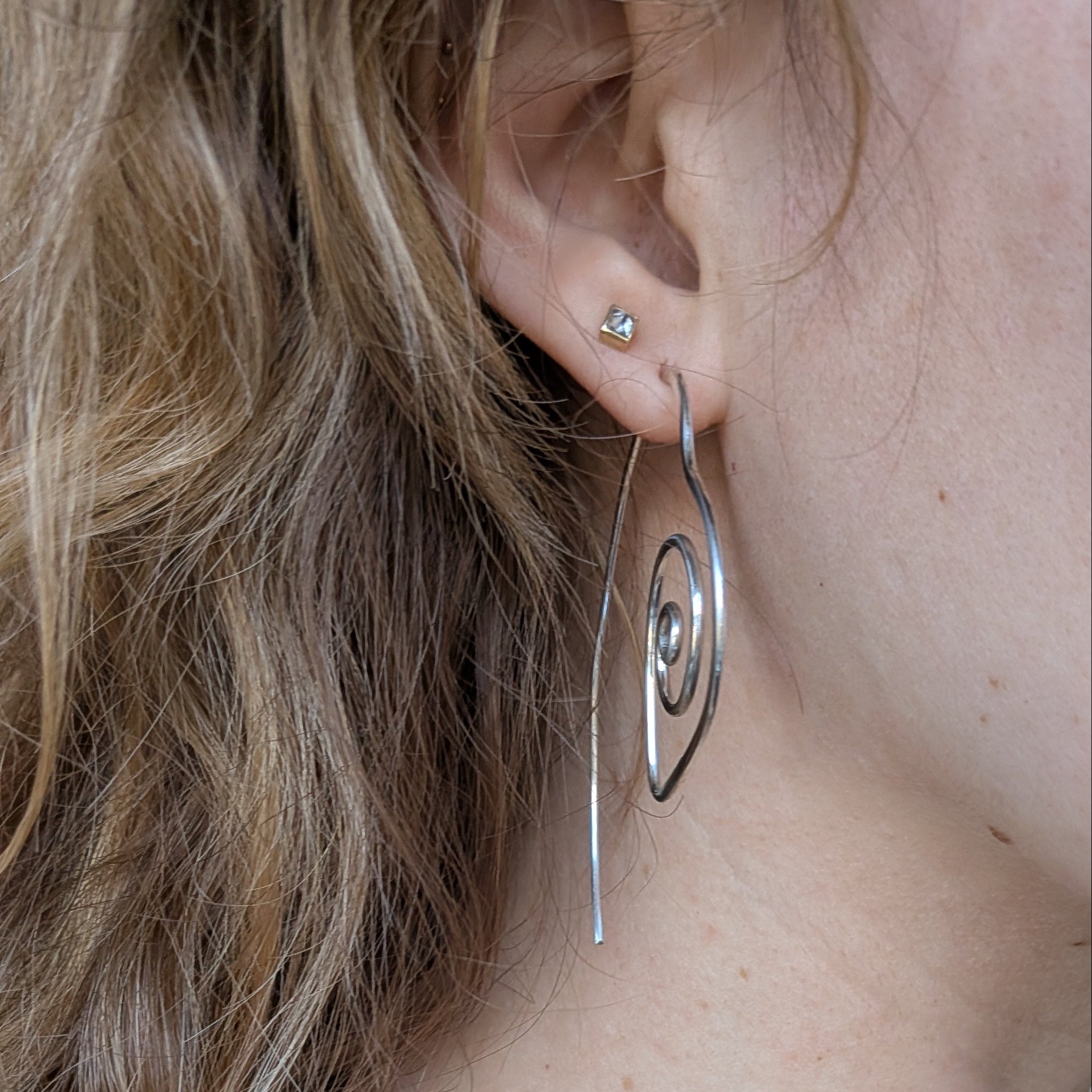 Handmade spiraling heart shaped earrings that wind their way through your lobes in an integrated, functional design.