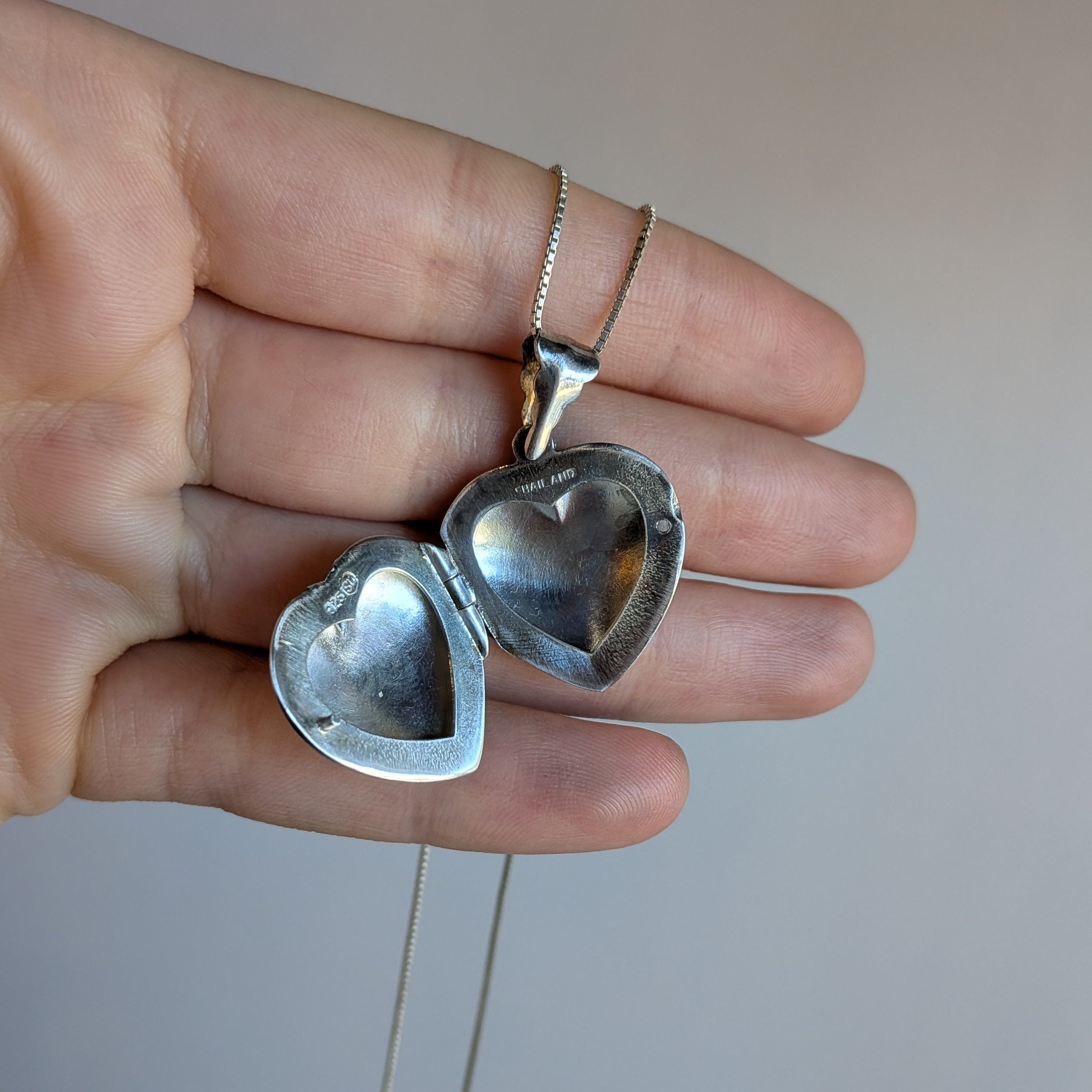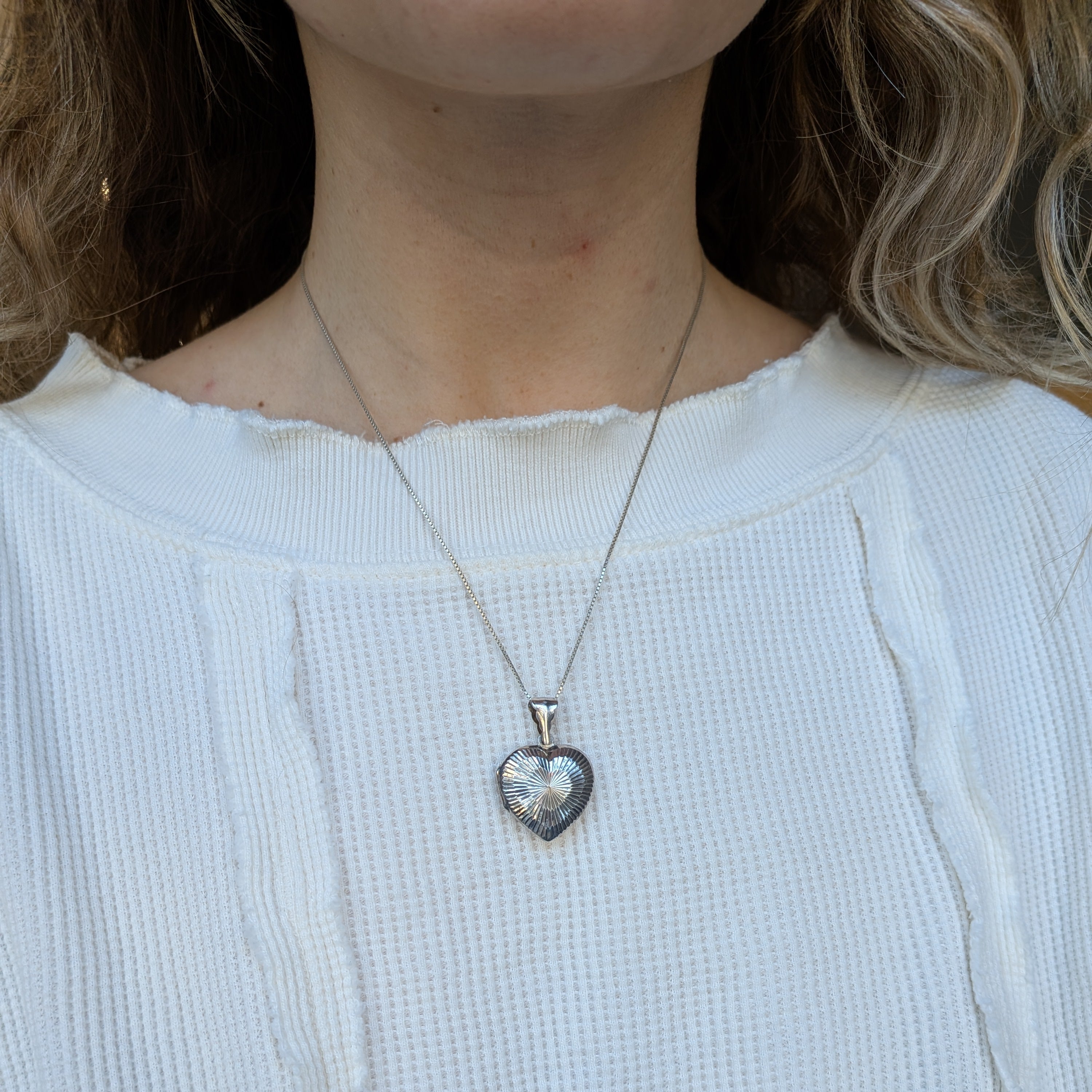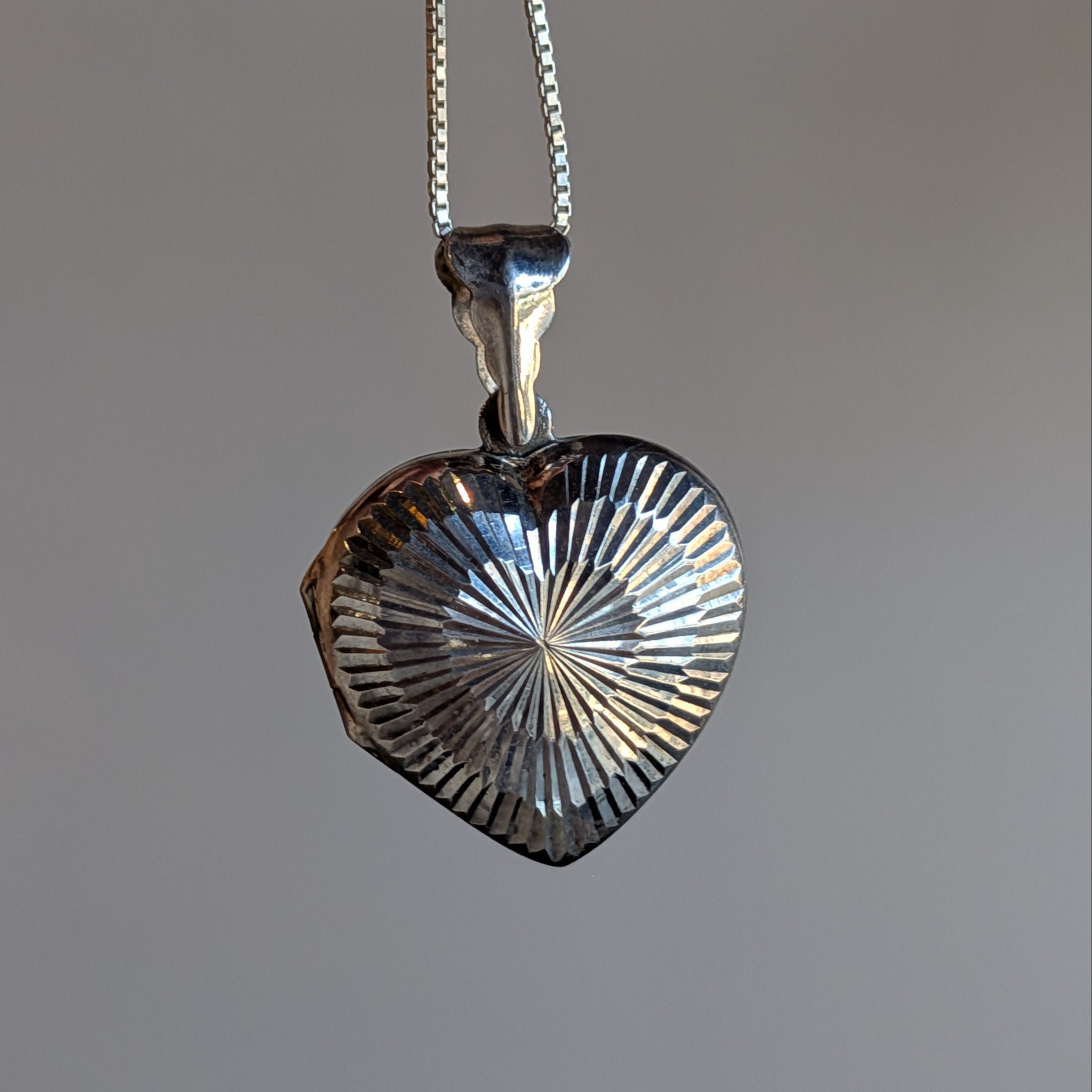 A classic heart locket crafted in sterling silver. The front face features bright cut engraved details that flicker in the light.