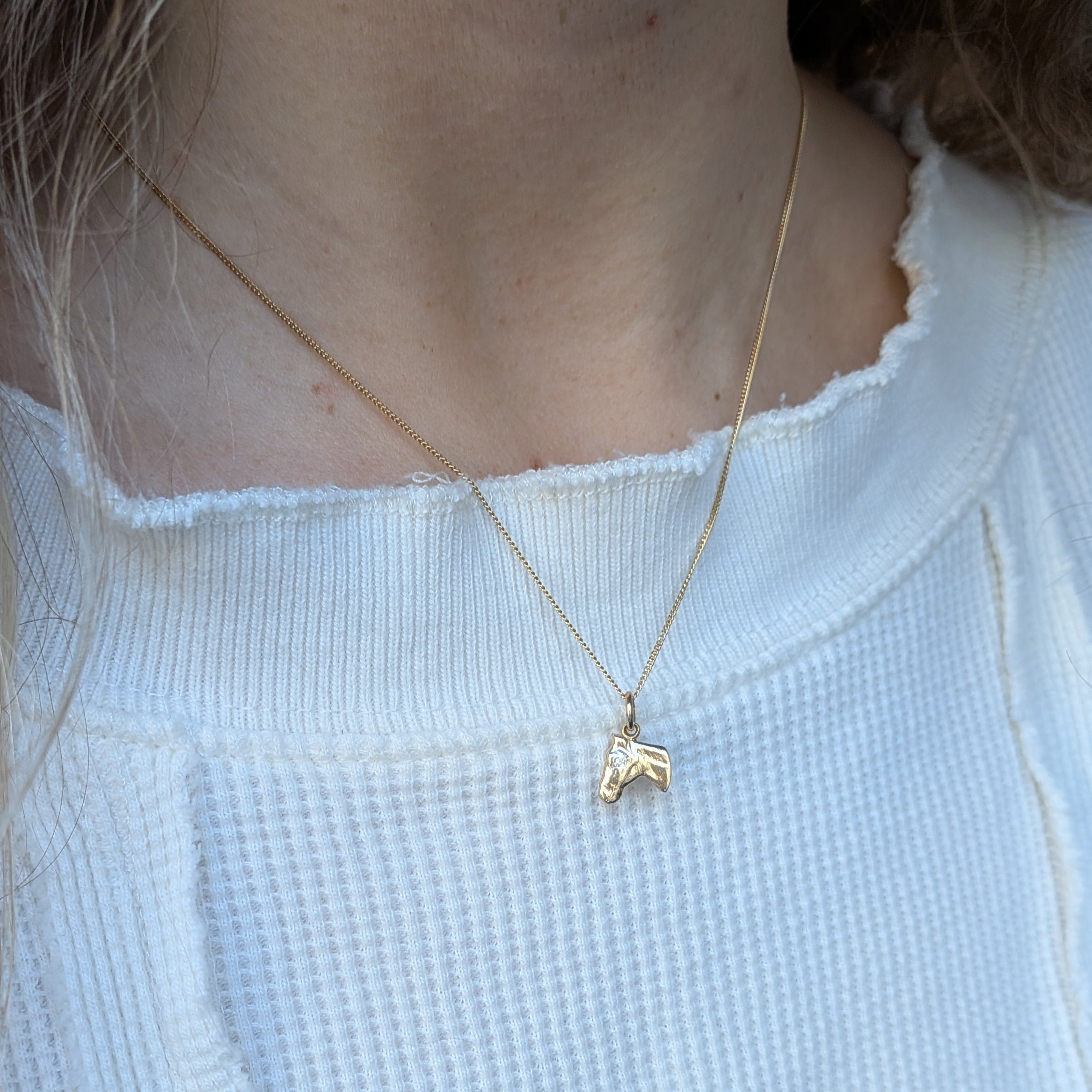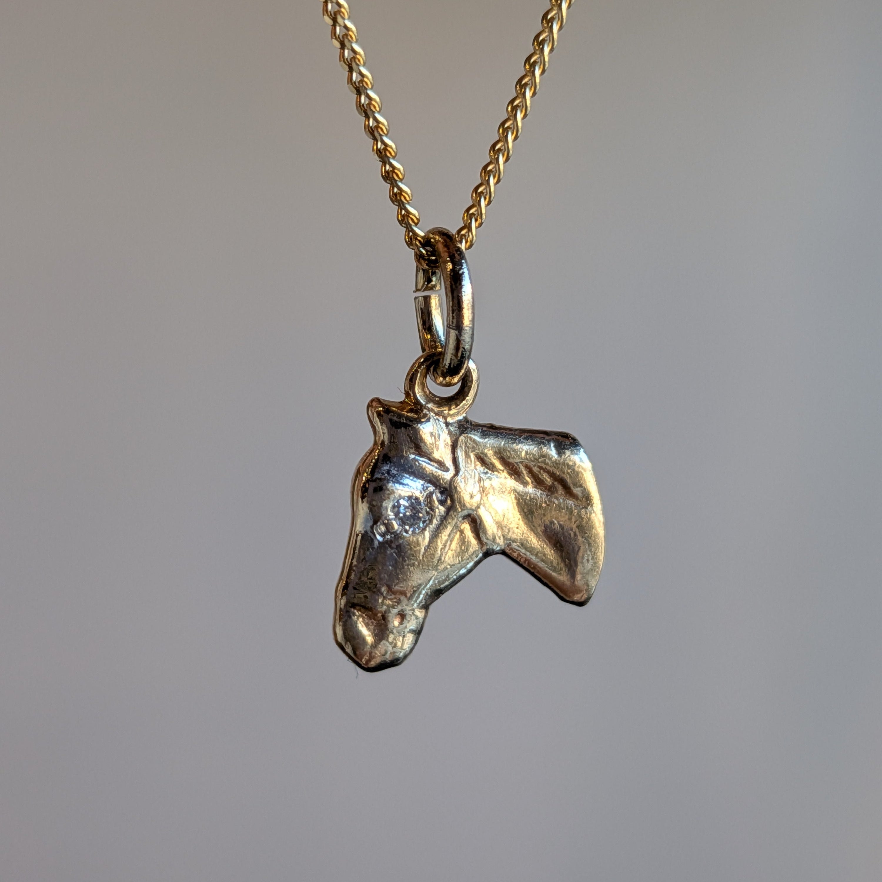 A horse guide with a touch of sparkle. Solid 10k with a bead set diamond eye.