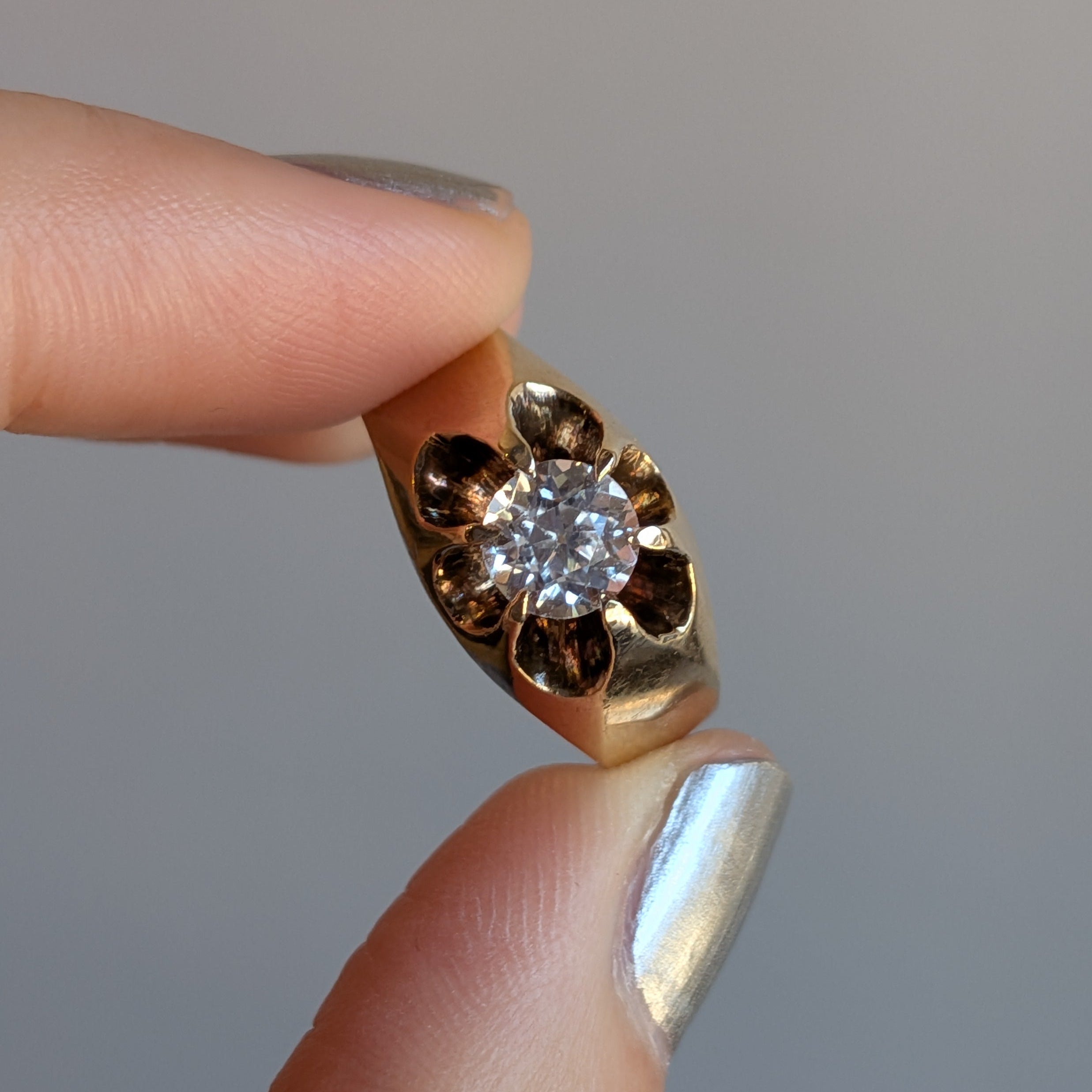 10k yellow gold Belcher style ring featuring a twinkling white sapphire.